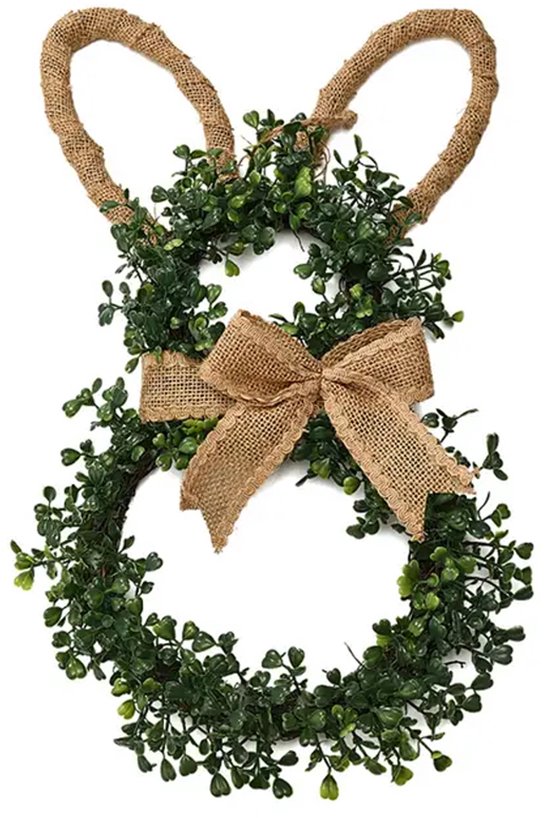 De krans is gemaakt van groene neptakken in de vorm van een paashaas, afgewerkt met schattige jute oortjes en strik. Hierdoor blijft hij altijd mooi en kun je hem ieder jaar opnieuw gebruiken. Daardoor is hij ook uitermate geschikt voor binnen en buiten gebruik. GRATIS VERZENDING!